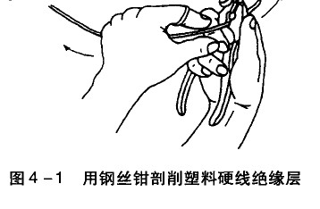 芯線截面為4mm,及以下的塑料硬線,其絕緣層用鋼絲鉗剖削,具體操作方法:根據(jù)所需線頭長度,用鉗頭刀口輕切絕緣層(不可切傷芯線),然后用右手握住鉗頭用力向外勒去絕緣層,同時(shí)左手握緊導(dǎo)線反向用力配合動(dòng)作,如圖4-1所示。