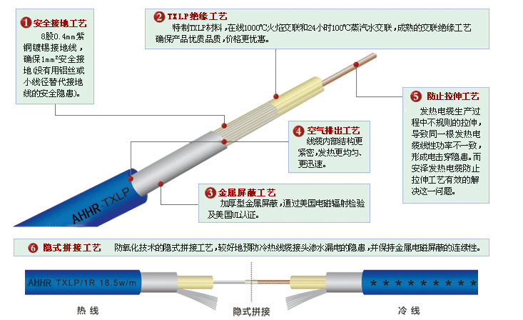 安徽環瑞研發了一種耐磨耐高溫型發熱電纜特點:是在傳統發熱電纜結構上增加了無色透明特氟隆絕緣層,與火焰及蒸汽交聯聚乙烯絕緣層構成雙層絕緣,更安全。解決了因外界溫度過高導致線纜擊穿的問題;解決了有傳統發熱電纜鋪設的地面上不能有覆蓋物的問題。