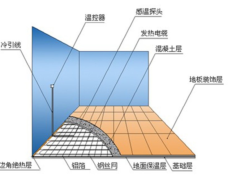 發(fā)熱電纜采暖系統(tǒng)由發(fā)熱電纜和溫控器兩部分組成,發(fā)熱電纜鋪設于地面中,溫控器安裝于墻面上。當室內環(huán)境溫度或地面溫度低于溫控器設定的溫度時,溫控器接通電源,發(fā)熱電纜通電后開始發(fā)熱升溫,發(fā)出的熱量被覆蓋著的水泥層吸收,然后均勻地加熱室內空氣,還有一部分熱量以遠紅外輻射的方式直接釋放到室內。該種方式的采暖系統(tǒng)把整個地面作為散熱器,室內溫度上層低而下層高,有溫足而頂涼的感受,使您感到舒適而自然。