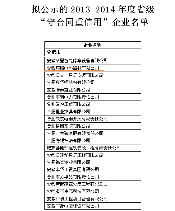熱烈慶祝安徽環瑞榮獲2013-2014年度省級“守合同重信用”企業